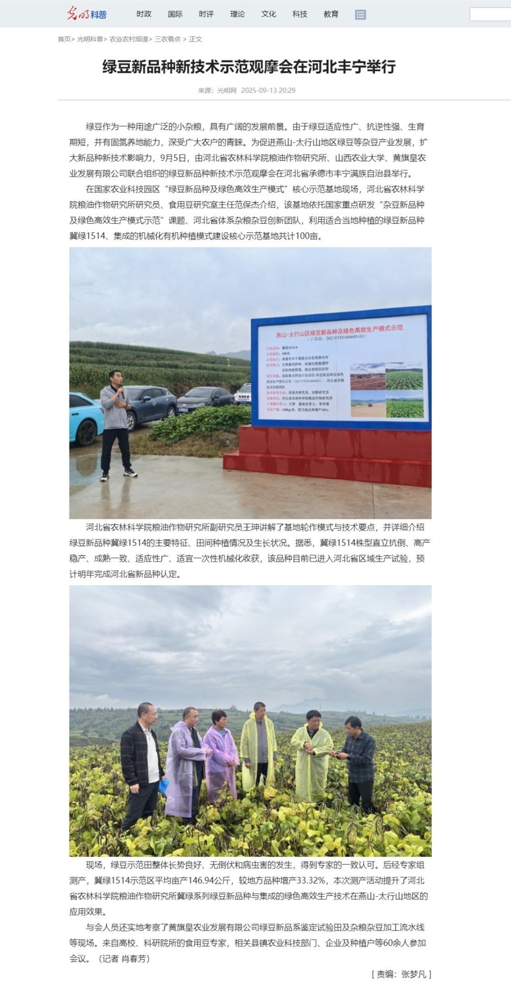 绿豆作为一种用途广泛的小杂粮,具有广阔的发展前景。由于绿豆适应性广、抗逆性强、生育期短,并有固氮养地能力,深受广大农户的青睐。为促进燕山-太行山地区绿豆等杂豆产业发展,扩大新品种新技术影响力,9月5日,由伟德bevictor中文版下载粮油作物研究所、山西农业大学、黄旗皇农业发展有限公司联合组织的绿豆新品种新技术示范观摩会在河北省承德市丰宁满族自治县举行。