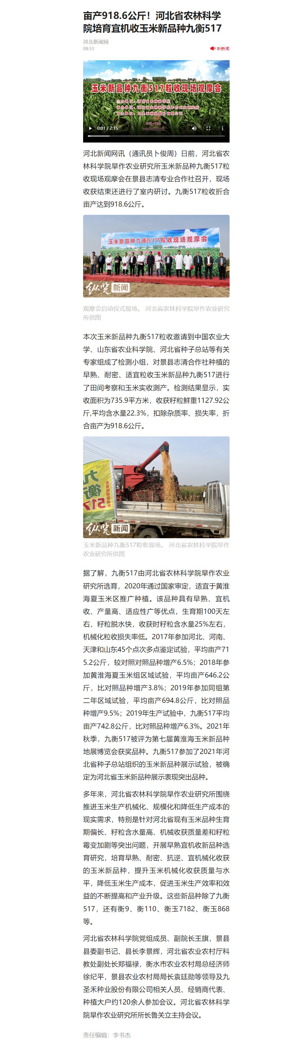 本次玉米新品种九衡517粒收邀请到中国农业大学、山东省农业科学院、河北省种子总站等有关专家组成了检测小组,对景县志清合作社种植的早熟、耐密、适宜粒收玉米新品种九衡517进行了田间考察和玉米实收测产。检测结果显示,实收面积为735.9平方米,收获籽粒鲜重1127.92公斤,平均含水量22.3%,扣除杂质率、损失率,折合亩产为918.6公斤。