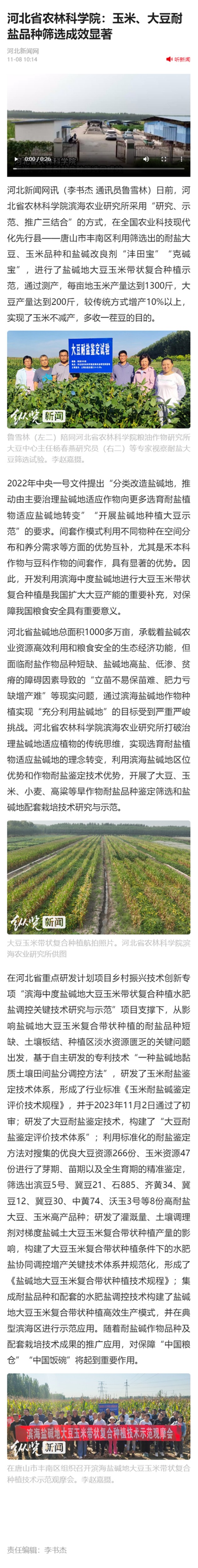在河北省重点研发计划项目乡村振兴技术创新专项“滨海中度盐碱地大豆玉米带状复合种植水肥盐调控关键技术研究与示范”项目支撑下,从影响盐碱地大豆玉米复合带状种植的耐盐品种短缺、土壤板结、种植区淡水资源匮乏的关键问题出发,基于自主研发的专利技术“一种盐碱地黏质土壤田间盐分调控方法”,研发了玉米耐盐鉴定技术体系,形成了行业标准《玉米耐盐碱鉴定评价技术规程》,并于2023年11月2日通过了初审;研发了大豆耐盐鉴定技术,构建了“大豆耐盐鉴定评价技术体系”;利用标准化的耐盐鉴定方法对搜集的优良大豆资源266份、玉米资源47份进行了芽期、苗期以及全生育期的精准鉴定,筛选出滨豆5号、冀豆21、石885、齐黄34、冀豆12、冀豆30、中黄74、沃玉3号等8份高耐盐大豆、玉米高产品种;研发了灌溉量、土壤调理剂对梯度盐碱土大豆玉米复合带状种植产量的影响,构建了大豆玉米复合带状种植条件下的水肥盐协同调控增产关键技术体系并规范化,形成了《盐碱地大豆玉米复合带状种植技术规程》;集成耐盐品种和配套的水肥盐调控技术构建了盐碱地大豆玉米复合带状种植高效生产模式,并在典型滨海区进行示范应用。随着耐盐碱作物品种及配套栽培技术成果的推广应用,对保障“中国粮仓”“中国饭碗”将起到重要作用。