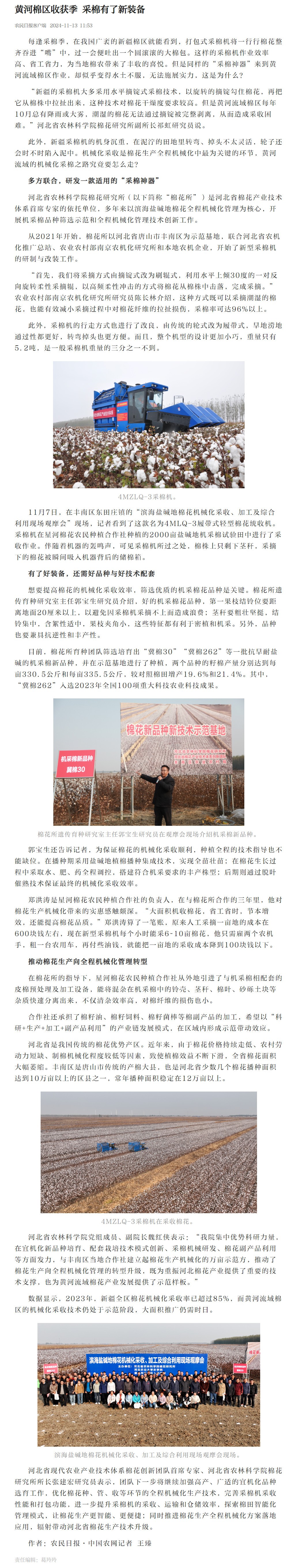 河北省现代农业产业技术体系棉花创新团队首席专家、伟德bevictor中文版下载棉花研究所所长张建宏研究员表示,团队下一步将继续加强高产、广适的宜机化品种选育工作,优化棉花种、管、收等环节的全程机械化生产技术,完善采棉机采收性能和打包功能,进一步提升采棉机的采收、运输和仓储效率,探索棉田智能化管理模式,让棉花生产更智能、更便捷;同时推进棉花生产全程机械化方案落地应用,辐射带动河北省棉花生产技术升级。