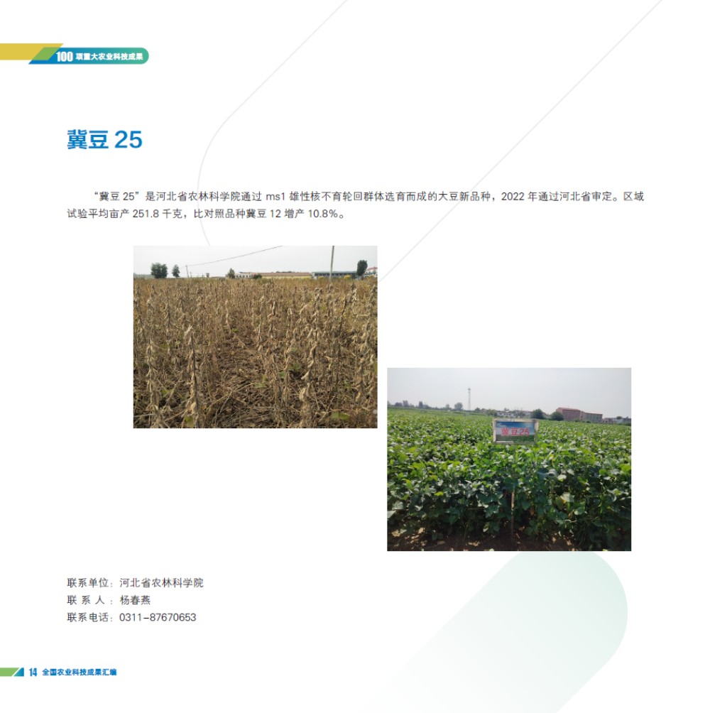 另外,小麦品种冀麦765、冀麦U68、冀麦U80,玉米品种冀玉757,大豆品种冀豆26、冀豆32,花生品种冀花521,甘薯品种冀元1号,棉花品种冀丰4号入选千项优秀农业科技成果。