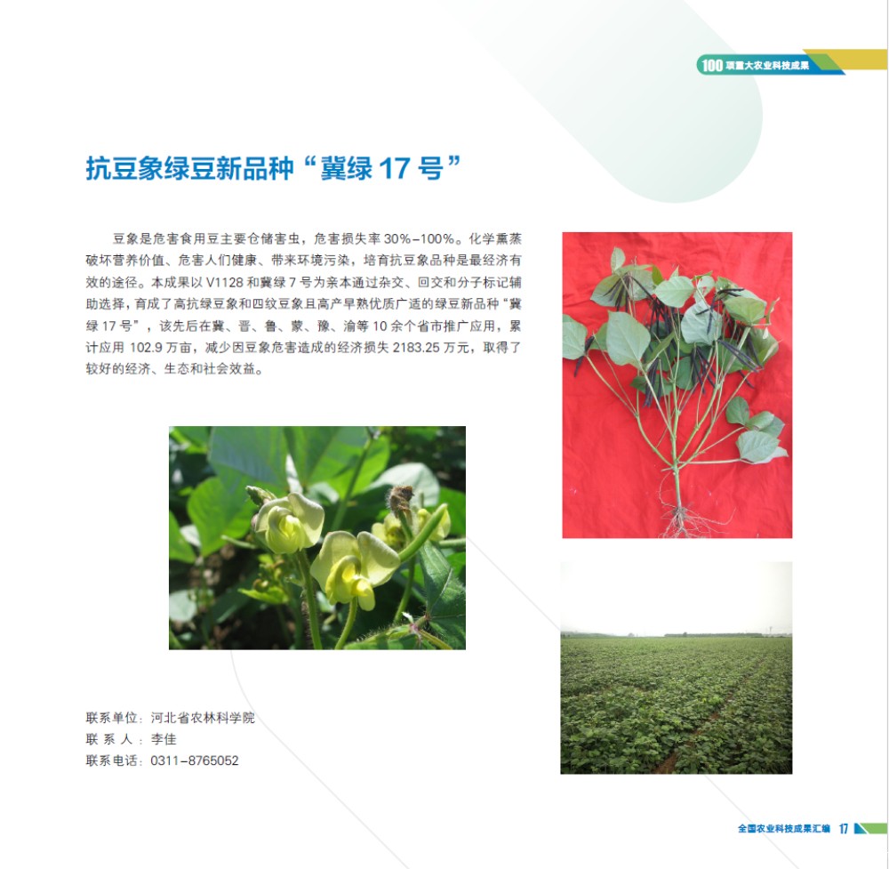 冀绿17号2022年通过中国作物学会食用豆专委会组织的品种鉴定,是河北省第二个抗豆象绿豆新品种,在冀、晋、鲁、蒙、豫、渝等10余个省市推广应用,累计应用 102.9万亩,减少因豆象危害造成的经济损失2183.25万元,取得了较好的经济、生态和社会效益。