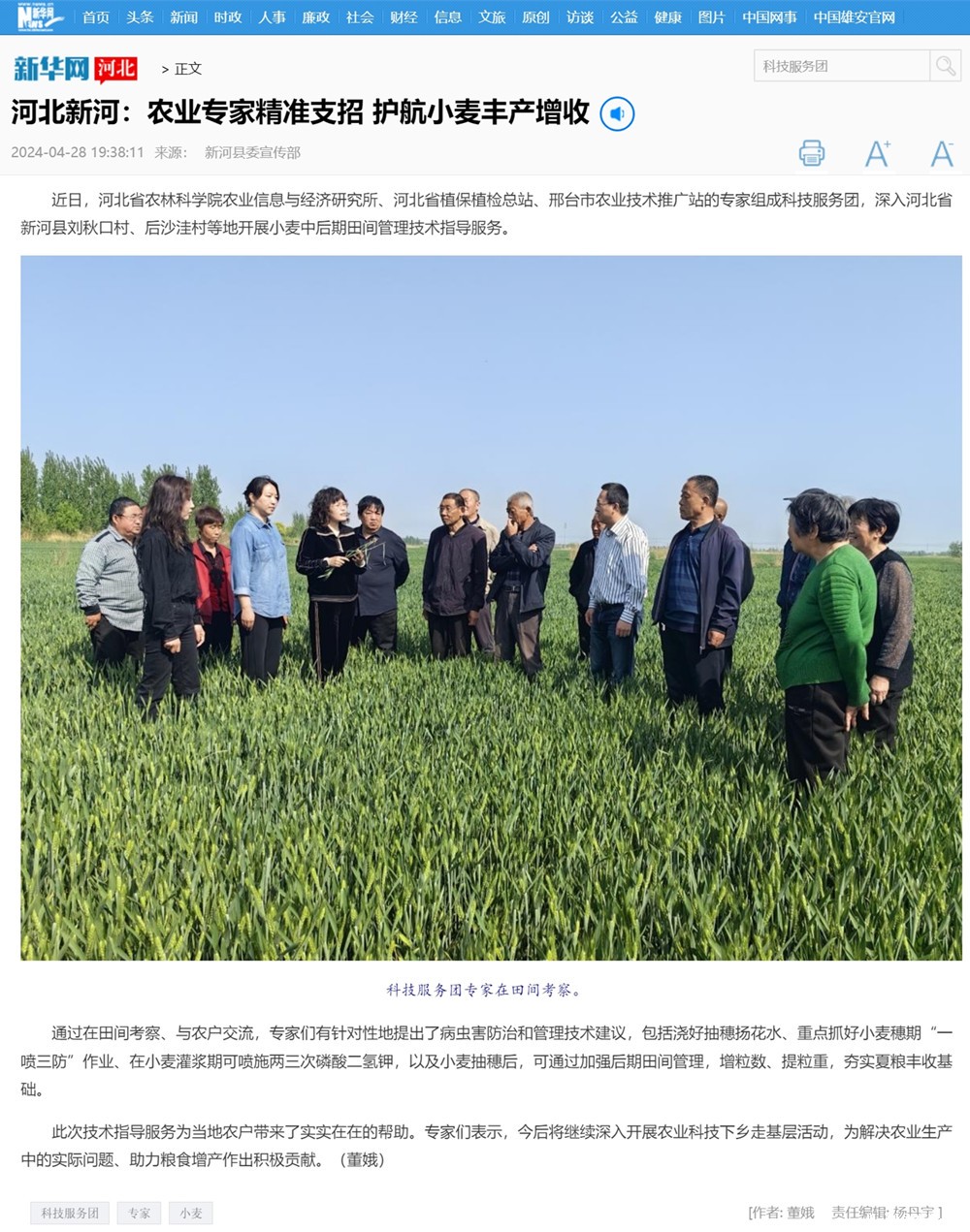 研究团队将产业经济研究与农业信息资源开发、微信等传播手段相结合做好技术的传播者,服务农业生产一线,此项工作得到老百姓的认可和称赞。新华社以“农业专家精准支招 护航小麦丰产增收”为题对团队的工作进行了相关报道。
