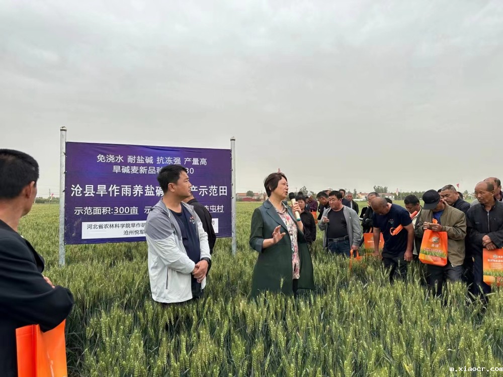 为提高旱碱地小麦产量,扩大优质旱碱麦的效益,5月20日,旱作所与河北衡研种业有限公司及沧州悦军农业服务有限公司在沧州市沧县刘浩屯村联合举办了衡麦30旱碱地示范观摩及培训会,河北省种子总站、沧州市种子站、沧县农业局、旱作所等相关负责人及沧县种植户代表共300多人参加了会议。