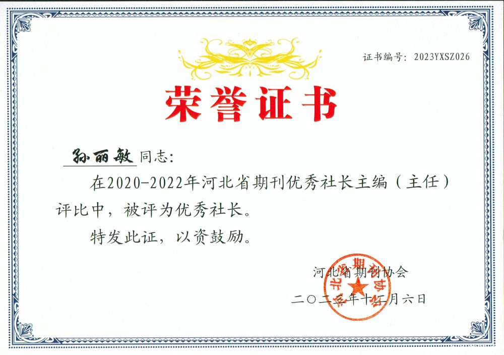 为促进全省期刊业繁荣发展,提高全省期刊编校质量和出版水平,打造品牌期刊,河北省期刊协会联合河北省出版物审读中心、河北省出版产品质量监督检测中心、河北省高校学报研究会、河北省科技期刊编辑学会对河北省2020-2022年出版期刊进行了评选,共评选出优秀期刊37种,特色栏目35项,好文章60篇、优秀社长(主任)28名,优秀编辑57名。我院主管、华北六省市农科院联合主办的《华北农学报》荣获河北省优秀期刊,编辑部主任、常务副主编孙丽敏荣获河北省优秀社长,责任编辑胡景辉荣获河北省优秀编辑,同时学报刊发的两篇文章获评好文章。