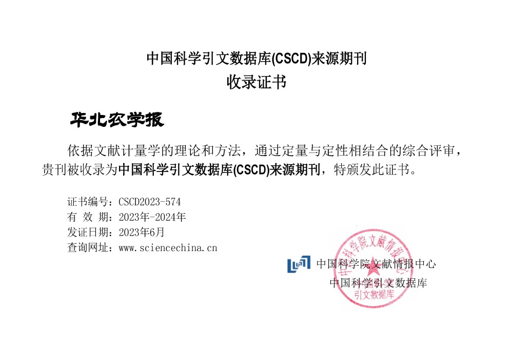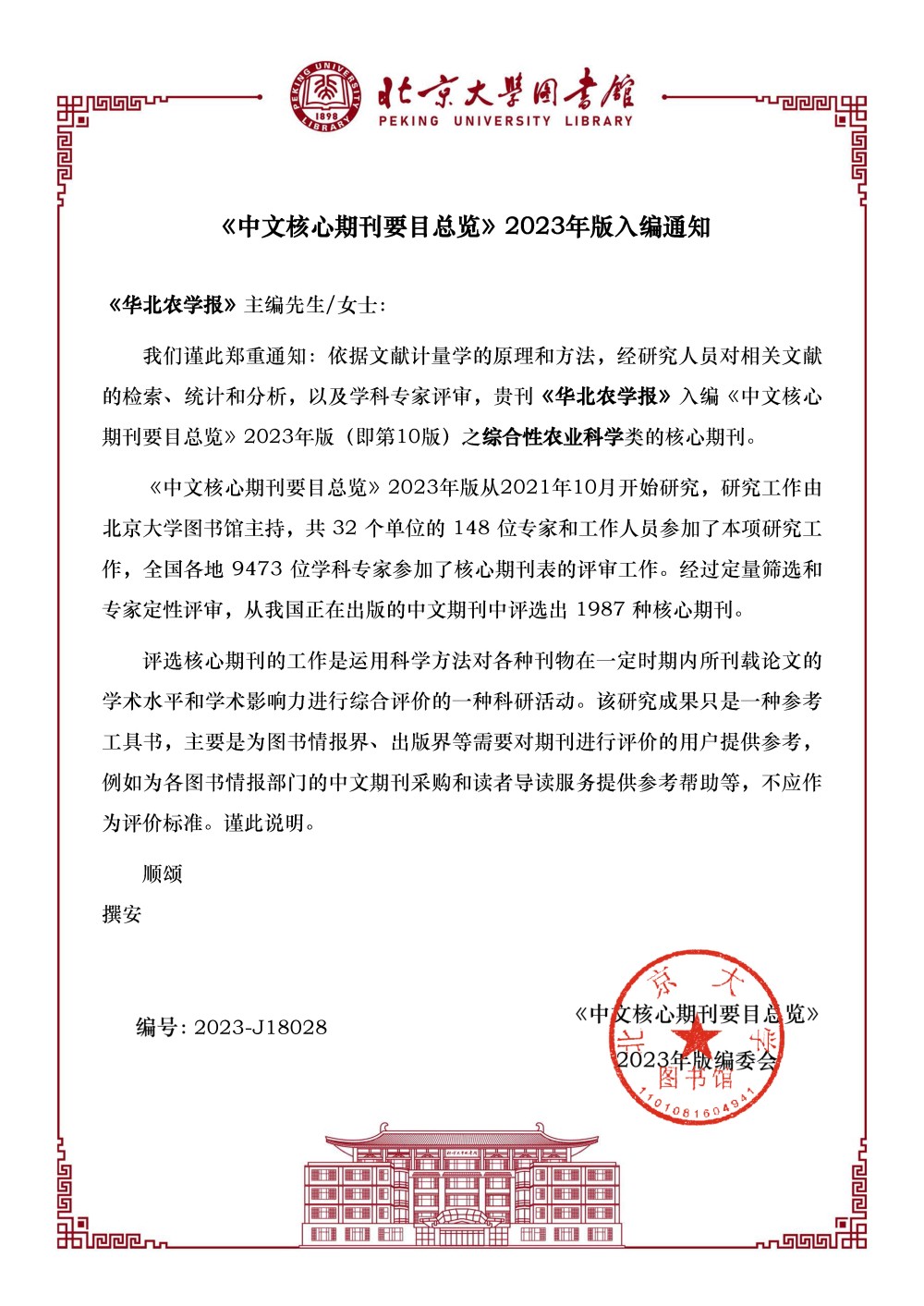 近期,《中文核心期刊要目总览》2023年版(即第10版)正式发布,我院主管、主办的《华北农学报》再次入选《中文核心期刊要目总览》综合性农业科学类核心期刊。《中文核心期刊要目总览》历经1992、1996、2000、2004、2008、2011、2014、2017、2020、2023年版共10版,这是学报自1992年首次入选以来第十次入选北大中文核心期刊。2023年版《中文核心期刊要目总览》由北京大学图书馆主持,全国9473 位学科专家参加了核心期刊表的评审工作,依据文献计量学的原理和方法,经过定量筛选和专家定性评审,评选出 1987 种核心期刊。