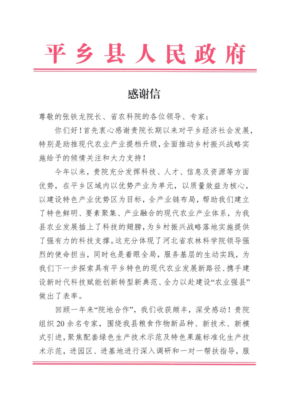 秦皇岛市人民政府丁伟市长、郭建平副市长等领导对科技合作成效予以肯定,并对合作以来存在的问题高度重视,批示秦皇岛市农业农村局予以落实反馈。平山县委张前锋书记、靳军县长等领导高度肯定了科技合作各项工作,并建议进一步深化与我院的合作。平乡县人民政府专程给我院发来感谢信,对我院技术帮扶县域现代农业产业提档升级方面发挥的积极作用表示感谢,并提出希望持续加强和深化与我院的合作,推动更多先进技术成果落地平乡,共同谱写新时代“院地合作”新篇章。
