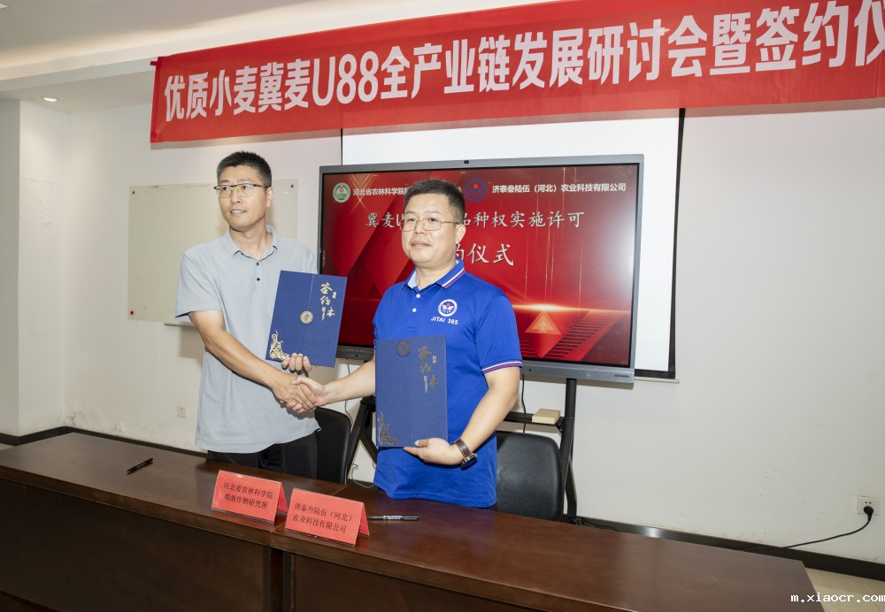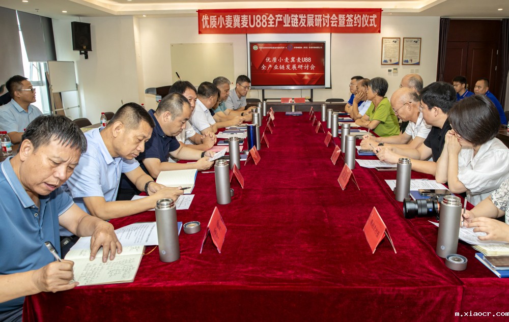 为共同探讨优质小麦全产业链的发展问题和创新模式,扩大优质小麦的种植面积,带动优质小麦产业发展,2025年7月17日,由我院粮油所主办,河北济泰生物科技集团有限公司承办的优质小麦冀麦U88全产业链研讨暨品种权实施许可会在河北省石家庄市顺利召开,会议由粮油所所长闫龙主持。