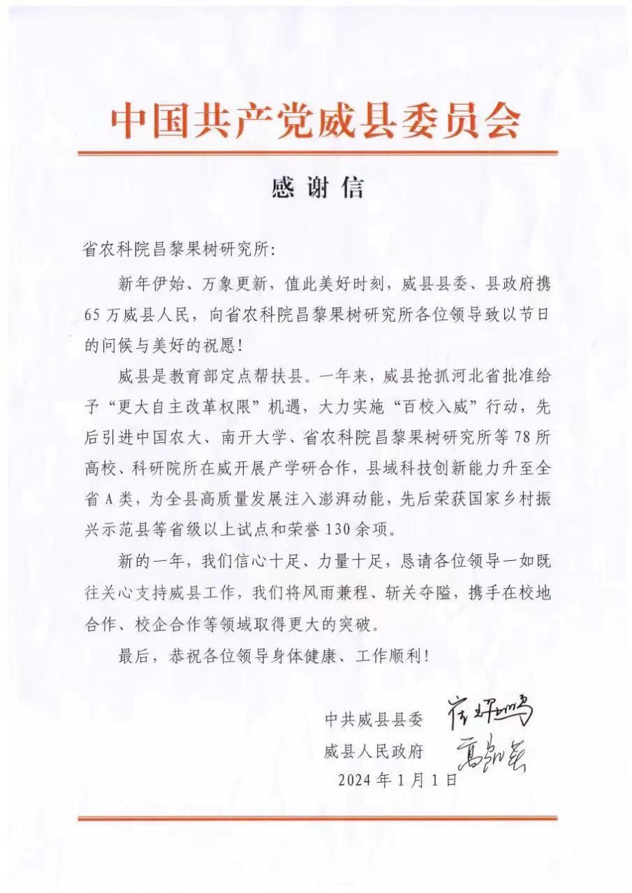 近日,威县县委、县政府为昌果所发来感谢信,感谢昌果所专家团队在威县开展产学研合作,助力其县域科技创新能力升至全省 A 类,为全县高质量发展注入澎湃动能。近年来,昌果所专家团队针对威县葡萄、梨等果树产业高质量发展的卡脖子问题,示范自育新品种,推广创新模式和技术,开展科技服务和技能培训,实施全产链绿色标准化体系,为推动威县一二三产融合及果品产业高质量发展做出了积极贡献。感谢信提出:在新的一年,威县县委、县政府希望持续深化与昌果所的合作,携手推动威县取得更大的突破。昌果所将一如既往,积极响应威县县委、县政府需求,进一步加大自主知识产权新成果在威县农业产业上的应用,全力为该县农业产业发展提供品种、技术、人才和智力支撑,助力该县农业产业高质量发展。