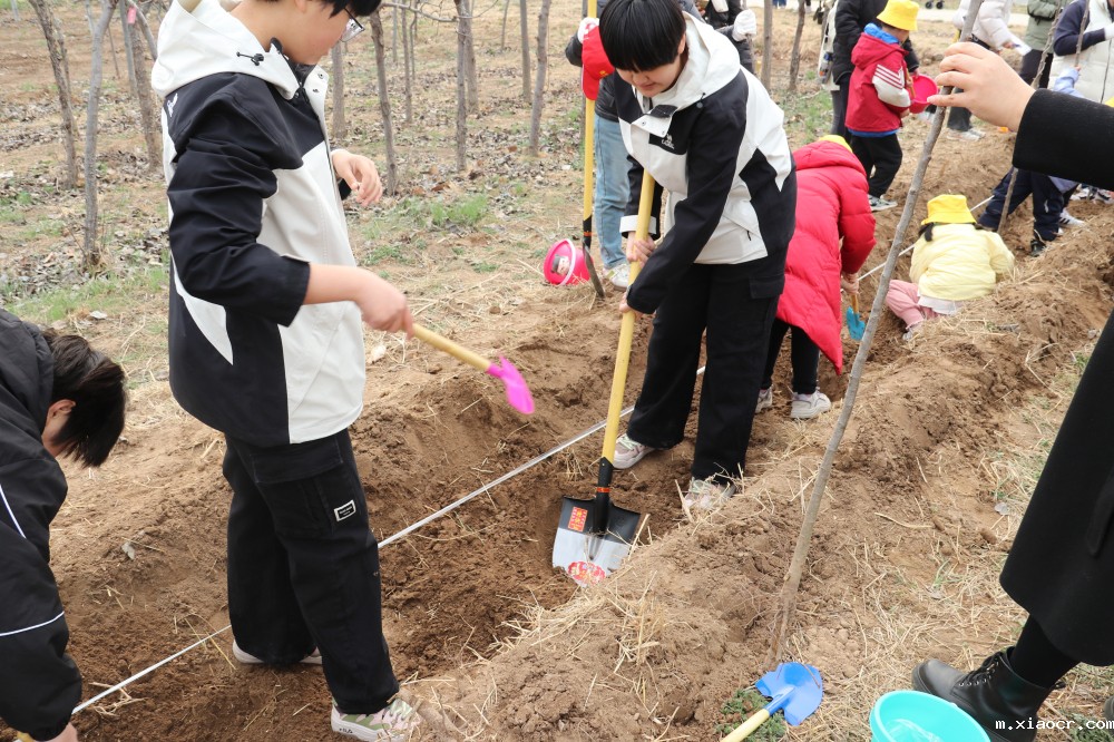 最后,25组亲子家庭到梨研究室试材地进行梨实生苗种植活动。梨研究室王晋博士详细讲解了梨苗的种植要点,并进行了实地操作。讲解完毕后,孩子们手持小铁锹和水桶,同家长们一起合力完成挖坑、栽种、填土、浇水等每一个步骤,并将写有自己名字的卡片挂在梨苗上。在整个种植过程中,王晋博士始终在一旁密切关注,随时提供专业的技术指导,耐心解答大家提出的各种疑问。活动现场一片欢声笑语,洋溢着温馨与幸福的气息。在亲手种植梨苗的过程中,孩子们不仅学到了实用的果树知识与技能,更深刻体会到了劳动的价值和大自然的神奇力量。